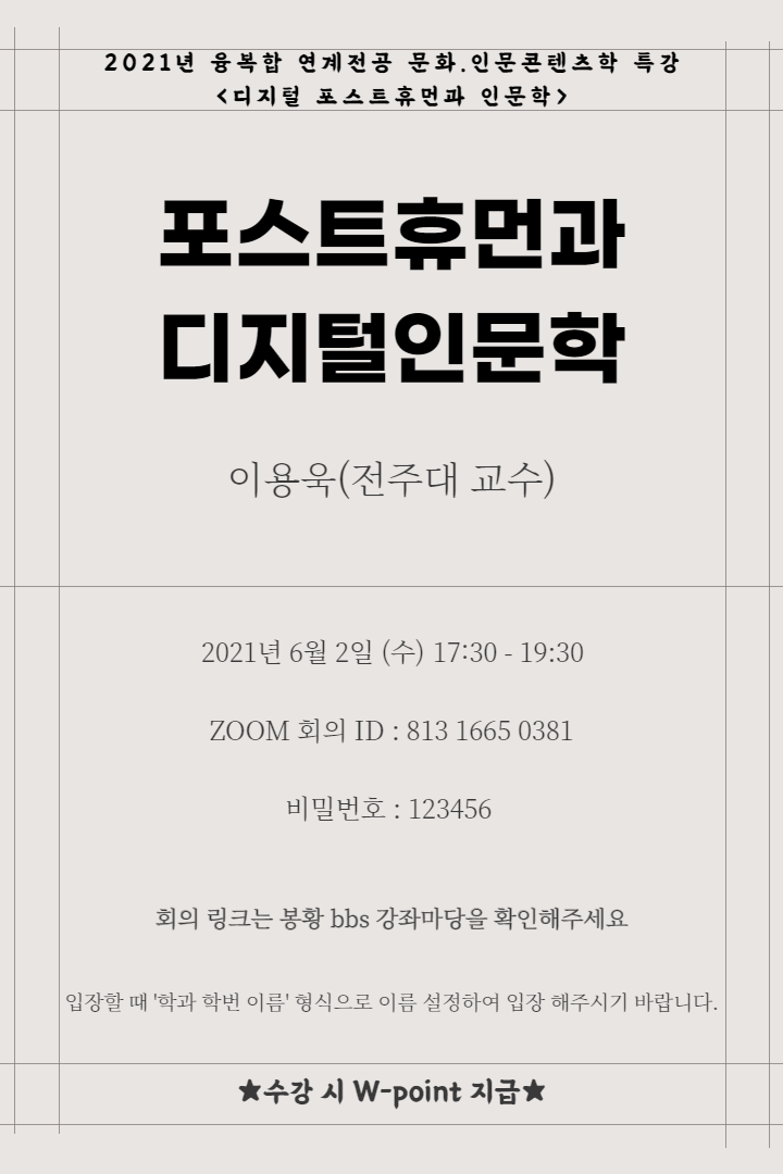[특강] 2021학년도 1학기 문화.인문콘텐츠학 특강 안내 “포스트휴먼과 디지털인문학”