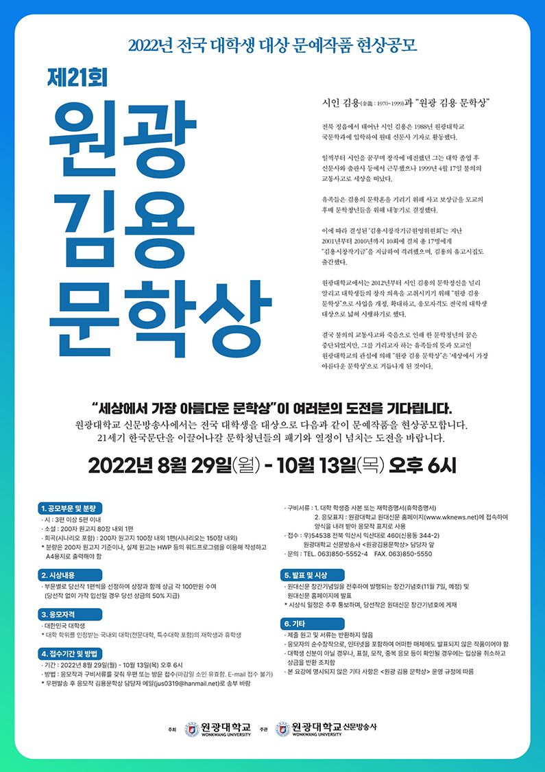 제출 방법: 우편또는 방문접수(우편 발송 후, 응모작 김용문학상 담당자 메일 jus0319@hanmail.net로 송부 바람)